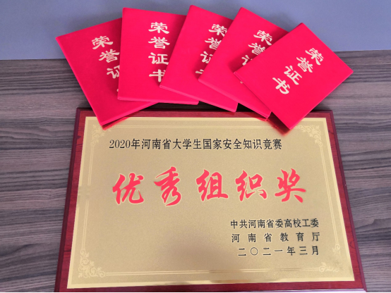 (通讯员张轩轩)3月15日,由中共河南省委高校工委、河南省教育厅主办的2020年河南省大学生国家安全知识竞赛决赛在郑州航空工业管理学院举行。我院辅导员张轩轩老师指导,学生王玉莹、梁婷婷、康凯宇、张泽文组成的代表队代表我校参加决赛。经过激烈角逐,我校代表队以团体总分第二名的成绩荣获“2020年河南省大学生国家安全知识竞赛决赛二等奖”,我院张轩轩老师荣获“优秀指导老师”荣誉称号。我校荣获“2020年河南省大学生国家安全知识竞赛优秀组织奖”。