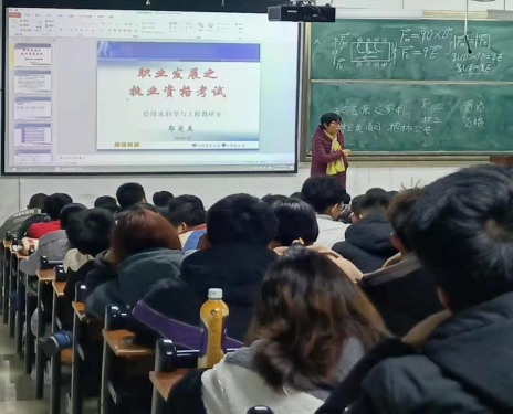 12月3日晚7点半,给排水科学与工程教研室郭爱美老师在7号教学楼419教室为学生组织了一次职业发展之执业资格考试专题讲座,旨在帮助学生合理进行职业规划,明确学习目标,交流学习方法。
