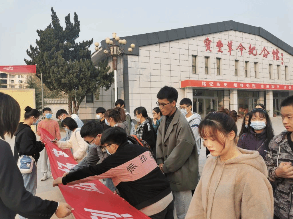 宝丰革命烈士纪念馆分为四部分,分别是“长夜难明五四曙光”、“星星之火 遍燃烽烟”、“师出豫西 解放宝丰”、“建立政权 拥军支前”。讲解员详细讲解了每一幅图片和每一件展品背后的故事,重现了那一段具有深远影响的革命岁月,在场的每位同学都感受了革命先烈们同仇敌忾,统一战线共御外患的英勇精神。馆内参观结束后,同学们在烈士纪念碑前默哀并三鞠躬,向革命先烈致以最崇高的敬意。随后,同学们在活动条幅上签字留念。
