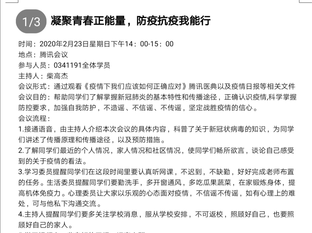 本次团日活动由各班团支部利用新媒体、直播软件、团支部微信群、QQ群开展线上活动,学习宣传抗击疫情过程中涌现出来的先进人物、先进事迹。首先由各班团支书对疫情发展进行报告,告诉同学们不必对疫情过度恐慌,但也不要放松警惕,告诫同学应该避免不必要的外出,减少户外活动,只有正确面对疫情才能有效的战胜它。接着团支书们在班群播放关于防疫的相关视频,同学们一同观看,积极主动参与讨论,针对此次疫情发表自己的看法,互相分享防疫知识,团结一致打好这场攻坚战。然后各班团支书对疫情期间各种谣言、诈骗进行举例,呼吁学生不信谣不传谣同时保护好自身财产安全,做知法懂法的大学生。最后团支书们对生活和学习问题进行总结,鼓励学生在家里规律作息,要求同学们做到“停课不停学、学习不延期”。号召同学们学习的同时不忘记体育锻炼,增加体质,提高免疫力。