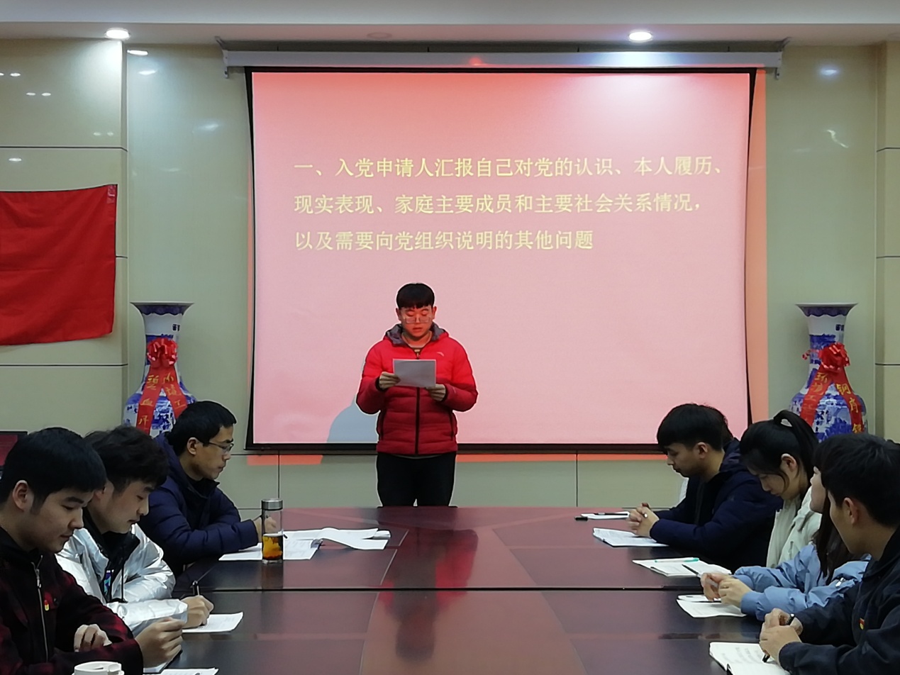 按照接收新党员程序,贺攀等十一位同学分别宣读入党志愿、汇报自己对党的认识、入党动机及有关情况;之后由发展对象介绍人分别向大会报告十一位同学培养考察情况,对其能否入党表明态度;支委会向大会报告对发展对象的审查情况,并就能否入党表明态度;经过支部党员充分讨论及不记名投票表决,一致同意贺攀等十一位同学加入中国共产党。