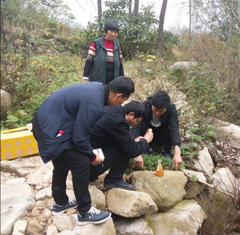 经过近两个小时的车程,精准扶贫饮用水安全检测小组到达了鲁山县尧山镇新庄村,经过和“第一书记”刘丽峰的交流,了解了新庄村村民饮水方式和水源情况,技术小组确定了水样采集方案。随后刘书记亲自带领我们分别在山上水源地和随机抽取的农户家中采样。取样团队克服了水源地海拔较高、山路崎岖、携带取样设备不便等困难,顺利完成新庄村的采样工作。完成采样已经下午一点多,精准扶贫饮用水安全检测小组一行人便马不停蹄驱车前往60多公里外的下一个取样地—库区乡搬走岭村。到达后,同样和当地驻村第一书记进行交流,掌握详细资料后,立即开展采样工作。