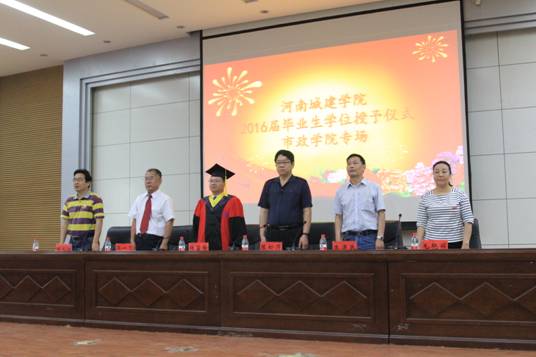 在庄严雄壮的国歌声里,典礼拉开帷幕。副书记朱泮民教授宣读了关于表彰2016届省级优秀应届毕业生的决定;副院长毛艳丽副教授宣读了关于表彰2016届校级优秀应届毕业生的决定;副院长田长勋副教授宣读了关于授予方晓敏等449名学生学士学位的决定。
