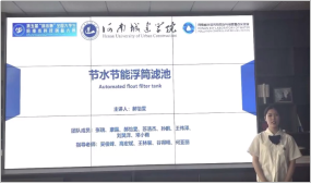 经过答辩和作品展示的综合角逐,3支队伍的参赛作品分别获得二等奖、三等奖和团体优秀奖。其中,由刘彪,高宏斌指导,学生吴慧南、靳一鸣、赵珈莹、梁婷婷的参赛作品《一体化原位水体修复生态浮船》获得二等奖,由吴俊峰,宋忠贤指导,学生刘子阳、王乾彬、李静、陈柄衡的参赛作品《一种用于供水系统中杀菌消毒的紫外线消毒装置》获得三等奖,由吴俊峰、高宏斌指导,学生王伟泽、张瑞、张瑞、郝怡雯、康露的参赛作品《一种节水节能浮筒滤池》获得团体优秀奖。
