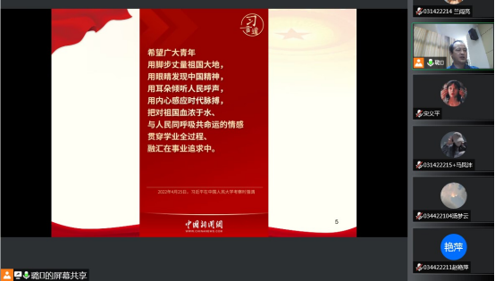 曹恒慧以“喜迎二十大,奋进新征程”为题,带领大家学习了习近平总书记2022年4月25日在中国人民大学考察时讲话精神、习近平总书记2016年4月30日在知识分子、劳动模范、青年代表座谈会上的讲话精神以及习近平总书记2014年9月9日同北京师范大学师生代表座谈会时的讲话精神。曹书记指出,新时代大学生要志存高远,立大志、干大事;要珍惜大学学习时光,练就过硬本领,为未来的事业发展和幸福生活奠定坚实基础;努力做到不负青春、不负理想、不负时代、不负人民,成长为实现中华民族伟大复兴中国梦的最强主力军。曹恒慧指出大学是人生的重要阶段,希望同学们尽早融进大学生活、给自己将来做好整体规划、养成良好的自我约束习惯、善于展示自己的才能、努力提升自己的综合素质、摆脱薄弱点提高自信、积极锻炼身体。曹恒慧要求同学们要学会知礼、诚信、担当、勤奋、阳光、敢于超越,做新时代合格大学生。