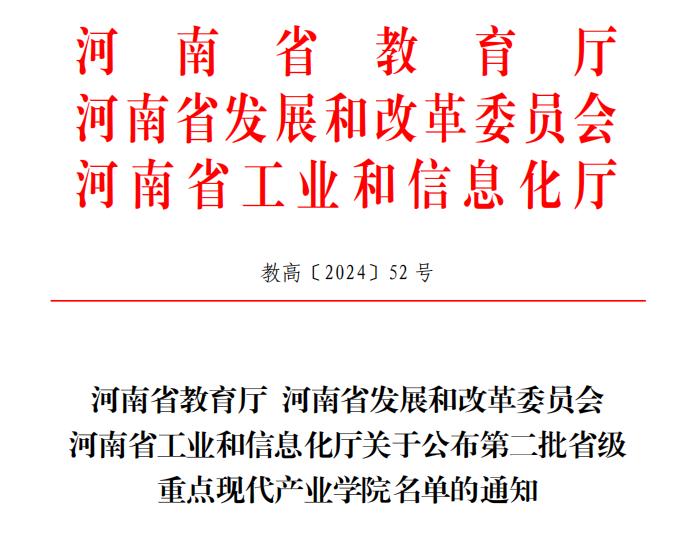 近日,河南省教育厅印发《河南省教育厅 河南省发展和改革委员会 河南省工业和信息化厅关于公布第二批省级重点现代产业学院名单的通知》(教高〔2024〕52号),我院申报的“先进环保装备现代产业学院”获批河南省本科高校第二批省级重点现代产业学院。