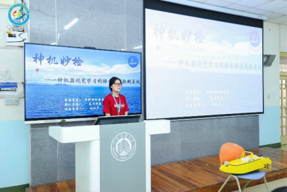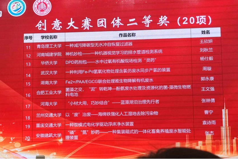 经过答辩和作品展示的综合角逐,由高宏斌指导,学生刘秋兰、许培格、姚萌洋的参赛作品《神机妙检—一种机器视觉学习的排水管道检测系统》获得团体二等奖;由黄雪征指导,学生柯远航、姚硕的参赛作品《脱氯袍穿氢衣—石墨烯助力纳米铁去除2,4—二氯酚》获得团体优秀奖。
