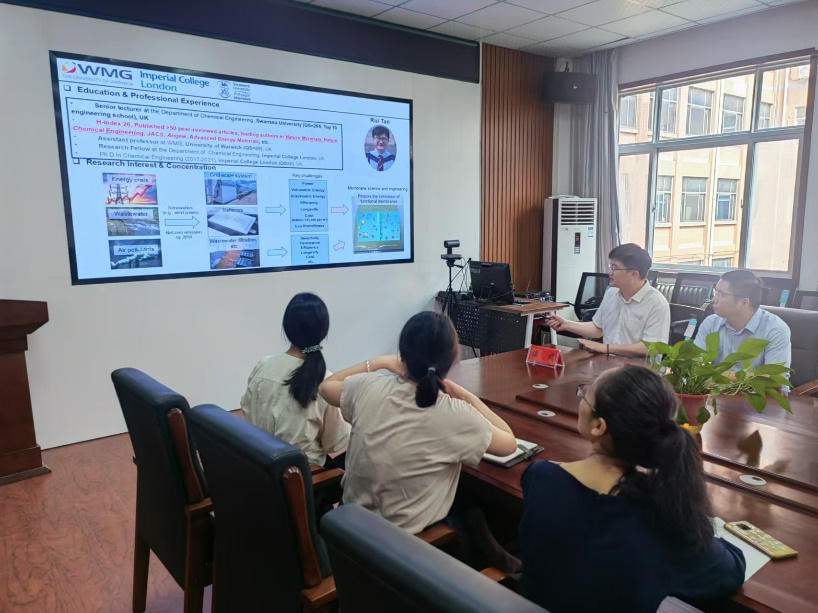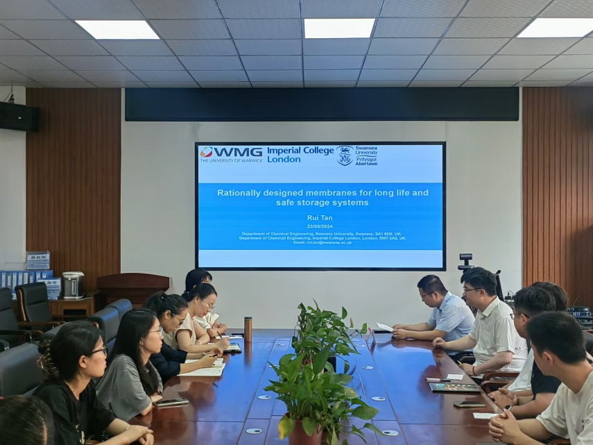 2024年8月23日上午,英国斯旺西大学谭瑞博士受邀来我院开展学术交流,并作了题为《Rationally designed membranes for long-life and safe energy systems》的精彩报告。报告由yl23411永利集团副院长姜忠峰主持,河南省绿色低碳水处理技术与水资源利用国际联合实验室、河南省水体污染防治与修复重点实验室研究人员及联培研究生聆听了谭瑞博士带来的新型导电聚合膜材料及电池储能装置的前沿科学知识。