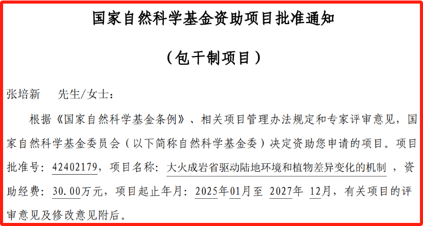 8月23日,国家自然科学基金委员会官网发布了《关于2024年国家自然科学基金集中接收申请项目评审结果的通告》,我院张培新博士申请的项目成功获批国家自然科学基金青年科学基金项目资助(项目批准号42402179)。
