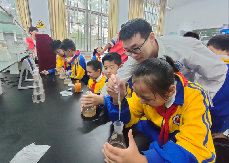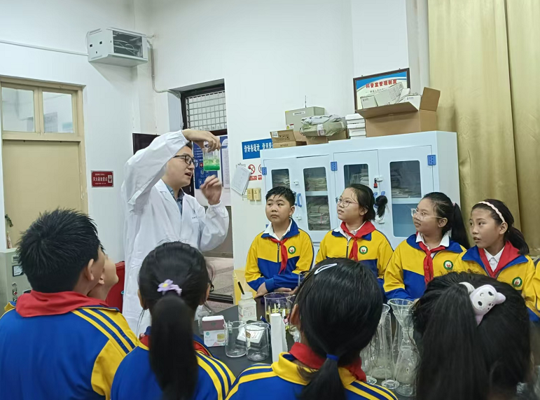 科学体验环节中设置了3个小实验。胡晓先博士带领同学们进行了“颜色去哪了”和“污水变变变”两个科学实验,让大家了解了水是如何变清澈的相关知识。郭翔博士以“绚丽的小火山”实验让大家走进身边的科学,提升同学们探索的兴趣。