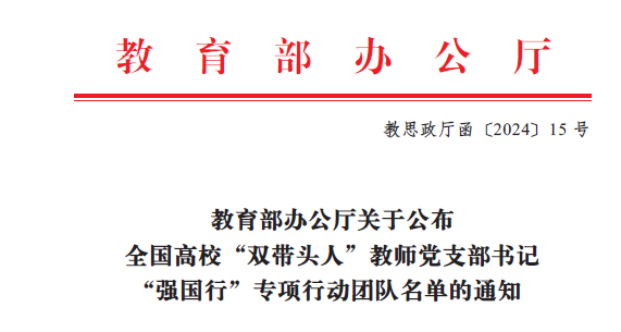 近日,教育部办公厅关于2024年全国高校“双带头人”教师党支部书记“强国行”专项行动团队名单正式揭晓,我院教工第一党支部成功入选。