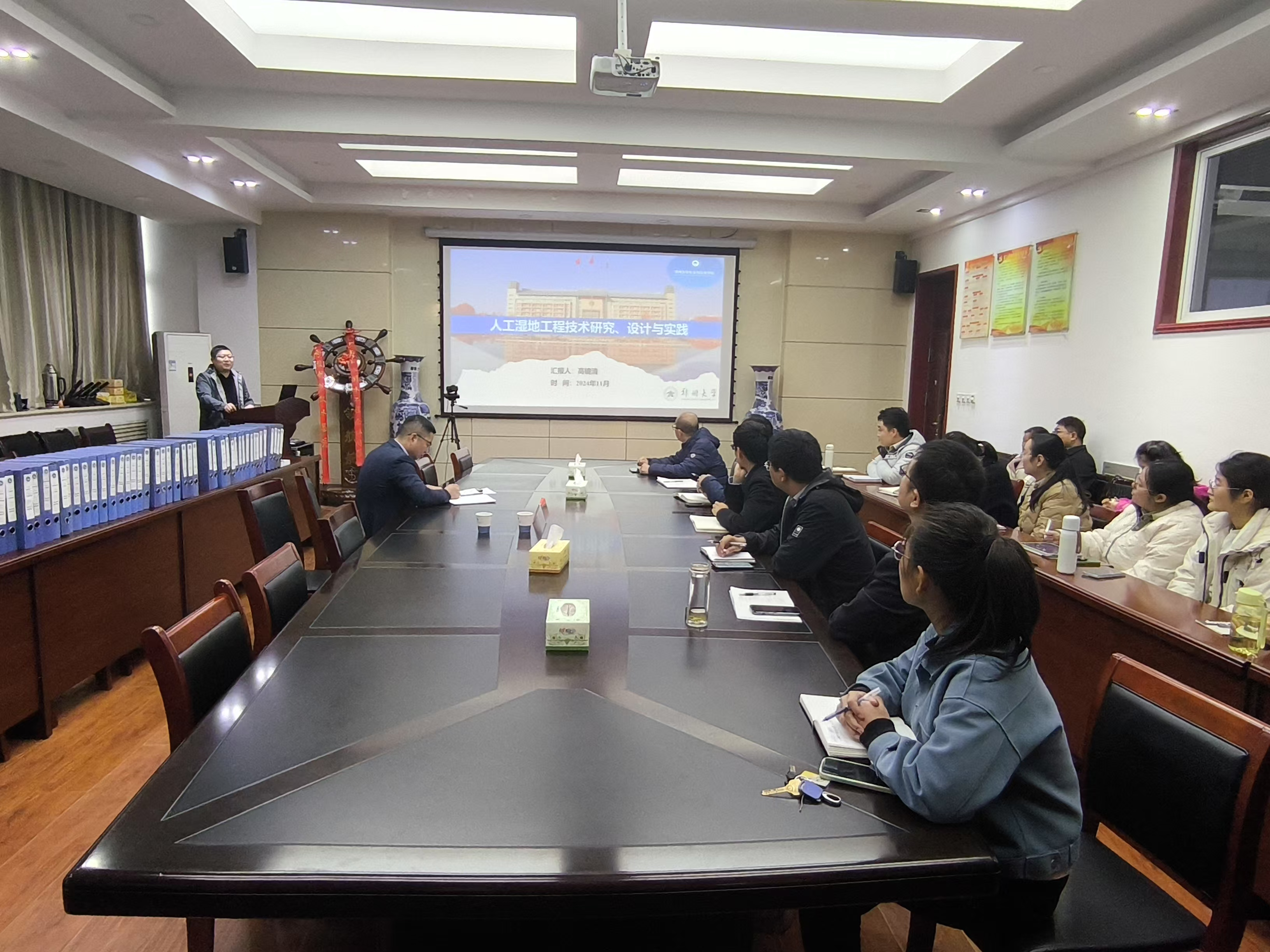 高镜清教授以《人工湿地工程技术研究、设计与实践》为题,围绕人工湿地技术发展进程及工程应用现状,介绍了取得的相关研究成果、设计经验和工程实践案例。高镜清教授与学院教师代表进行了座谈交流。