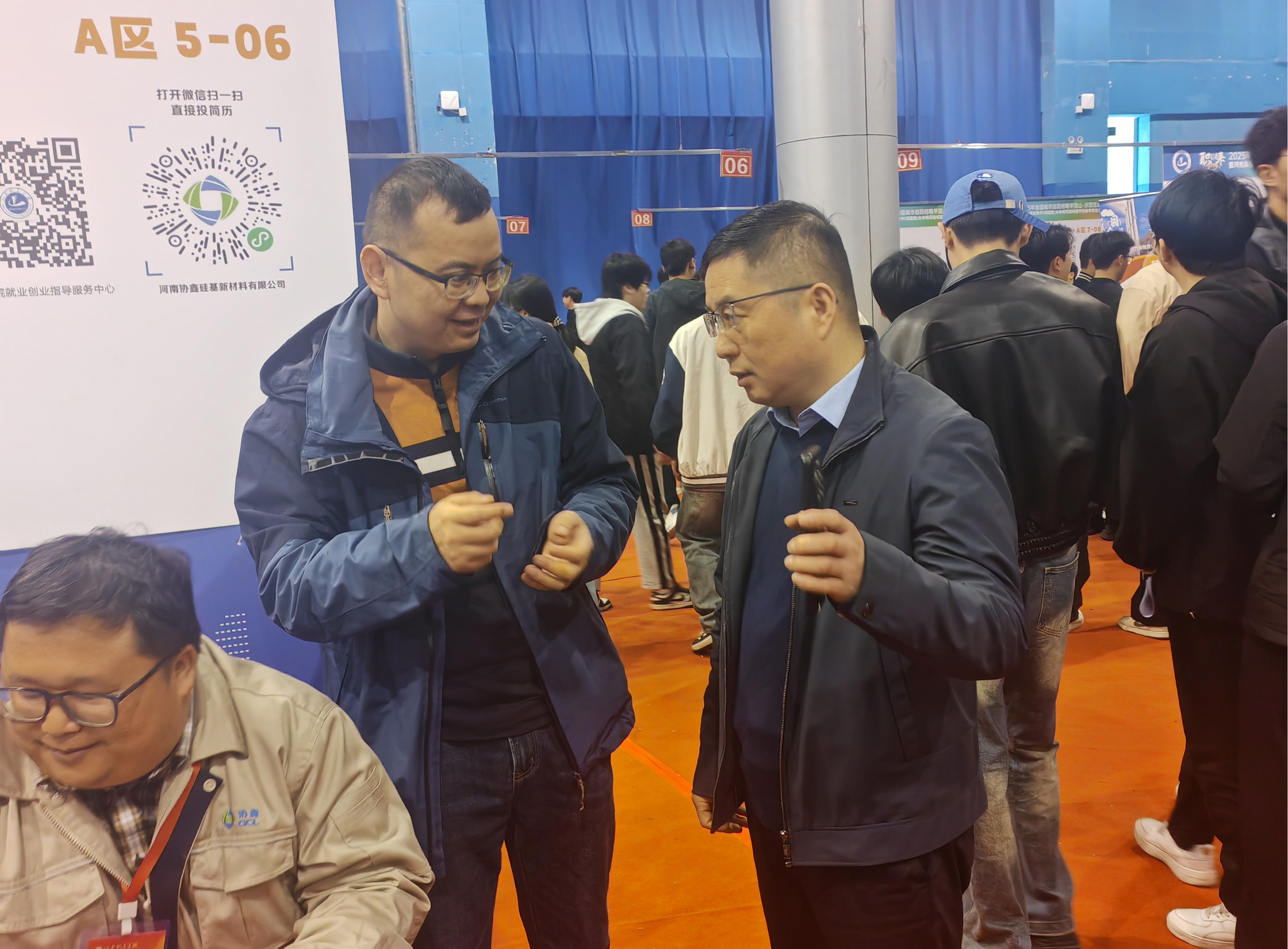 此次双选会中,姜忠峰先后与河南协鑫硅基新材料有限公司、多氟多新材料股份有限公司等多家企业进行交谈,深入了解企业用人需求和就业市场形势,认真听取企业对学院人才培养和毕业生就业的反馈建议,为提升人才培养质量、优化就业指导服务提供宝贵参考。在与企业负责人交流中,姜忠峰介绍了学院的人才培养状况,并着重强调,学院高度重视培养学生的创新精神和实践能力,他表示期待与企业携手,共同推动人才培养与就业工作的深度融合。
