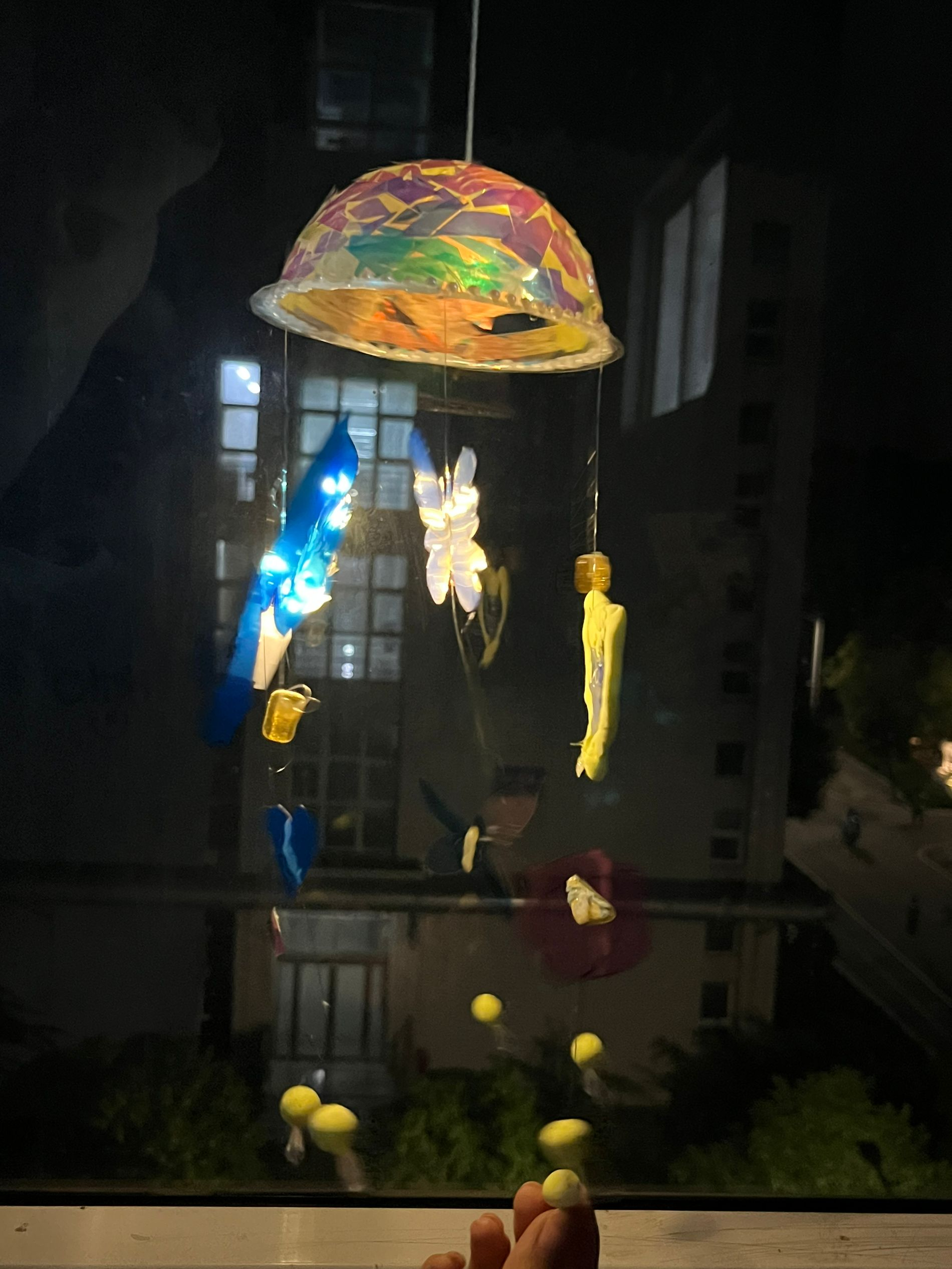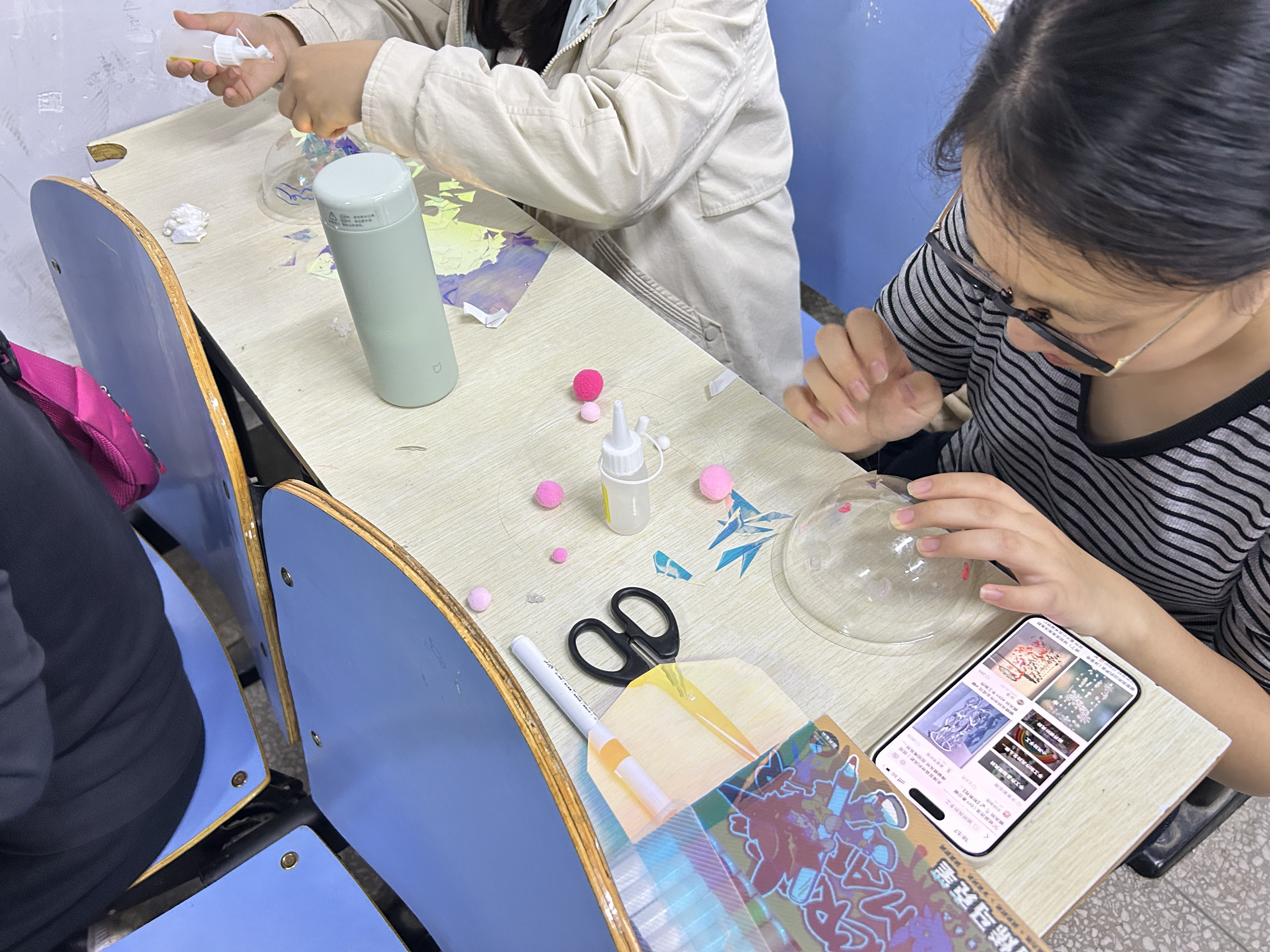 同学们相互合作,友好交流,将创意转化为一件件精美的风铃作品。“涂鸦式”风铃以其独特的艺术风格引人注目,“星星”风铃则寄托了参与者们对美好未来的向往,“许愿瓶”风铃更是将愿望与手工制作完美融合,展现了学生们的独特视角和创造力。