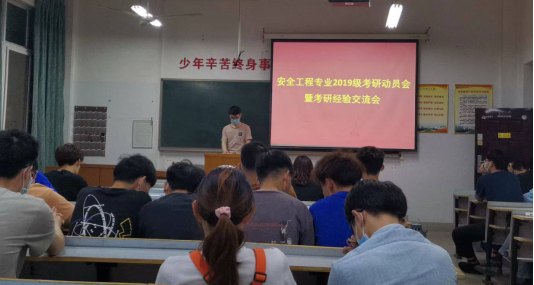 在交流会上,首先,安全工程系主任贾炳就目前考研形势、就业形势、为什么考研、如何选择院校、如何考上研究生等内容与学生进行了交流;然后,2018级学生代表结合自身考研经历,从院校选择、复习技巧、面试技巧等方面进行了经验分享,并针对同学们关于考研问题逐一解答;最后,安全工程系副主任娄全对相关问题进行了补充,并总结。