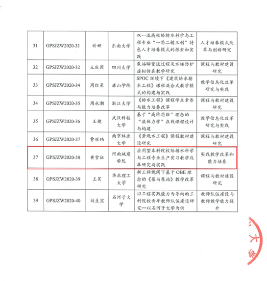 近日,教育部给排水科学与工程教指委组织专家对2020年度获批的40项教学改革项目进行了评审,我校yl23411永利集团黄雪征老师主持承担的教学改革研究项目“应用型本科院校给排水科学与工程专业生产实习教学改革研究与实践”(项目编号:GPSJZW2020-38)顺利通过结题验收。这是我校首次获批教育部给排水科学与工程教指委项目,同期获批的还包括清华大学、华中科技大学、东南大学、浙江大学、四川大学等高校。