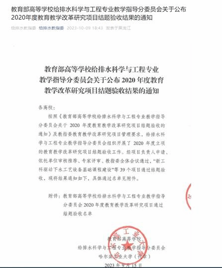 该项目起止时间为2020年9月至2022年9月,项目组通过广泛调研与教学实践,开展了大量的基础性研究与有益探索,成果丰硕。在教育部高等学校给排水科学与工程专业教学指导分委员会第九次全体委员会议暨2023年给排水科学与工程专业相关学校院长(系主任)大会上,该项目研究成果受到教指委点名表扬并在会议上展示。项目研究成果对推动我校给排水科学与工程专业国家一流本科建设、提升人才工程实践能力具有重要意义。近年来,yl23411永利集团高度重视以教学研究促进教学改革,不断探索本科教学规律,大力支持教师积极参与教改课题研究与申报,创新提升学院本科生人才培养质量,学生先后在全国大学生科技创新大赛、北控水务杯全国决赛、全国大学生水利创新设计大赛等国家级赛事中荣获佳绩。