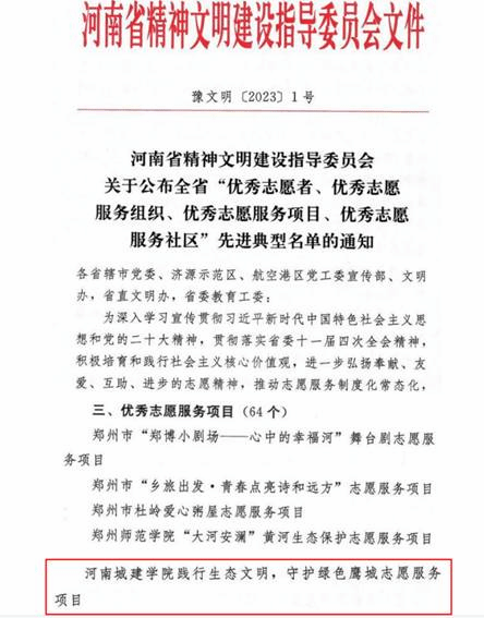 (通讯员:杨冰 贾彩云)日前,河南省精神文明建设指导委员会公布了2022年度河南省学雷锋志愿服务“四个优秀”先进典型名单,我院践行生态文明,守护绿色鹰城志愿服务项目荣获河南省“优秀志愿服务项目”荣誉称号。