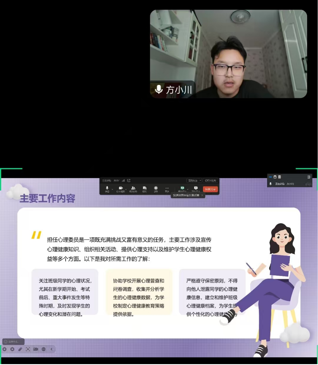 会上,院学生会心理部和各班级心理委员汇报了本年度心理健康教育开展情况。王璐璐老师肯定了院学生会心理部和各班心理委员一年来的辛苦付出,并对未来工作提出期望与要求,勉励心理委员加强学习,明确责任、提高能力,做好心理健康的传播者、朋辈心理辅导的践行者和守护者。