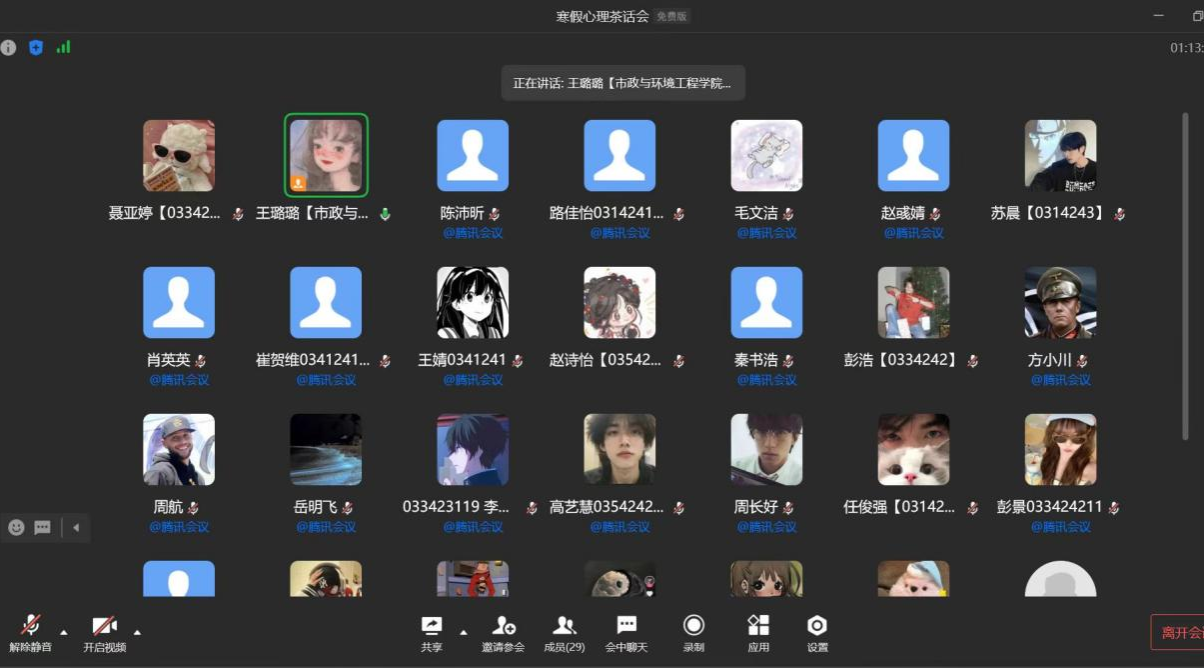 为扎实做好寒假期间学生心理健康教育工作,提升心理委员履职能力,进一步拓展我院心理育人工作主体、建强我院心理育人学生队伍、充分发挥心理委员朋辈优势,1月20日我院以腾讯会议形式开展“走进心委,聆听心声”--共话成长寒假心理茶话会活动,会议由学院“政好愈见”心理辅导站王璐璐老师主持,各班心理委员共40余人参加。
