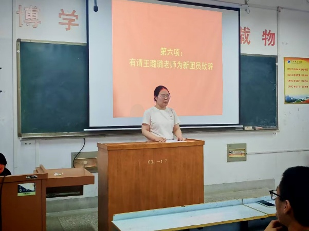 仪式现场气氛庄重热烈,主持人宣读完新团员名单后,王璐璐老师和曹玉婷老师为每一位新团员佩戴上团徽。王老师代表学院团组织向新团员们表示最热烈的祝贺,勉励大家要时刻铭记入团誓言,筑牢理想信念根基,勤奋学习,锤炼本领,在学习生活中争当先锋表率,在奉献中展现青春风采。仪式最后,全体师生肃立,齐声高唱中国共产主义青年团团歌《光荣啊,中国共青团》。