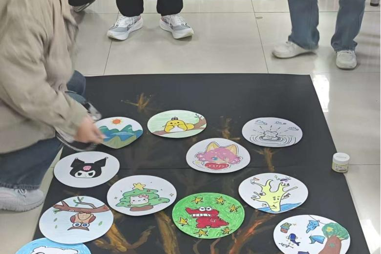 本次活动以“艺术疗愈”为核心抓手,精心设计“引导-创作-协作-分享”四大闭环环节,让新生在沉浸式体验中实现心理赋能。活动伊始,通过“种子生长”意象冥想与肢体互动破冰游戏,引导新生舒缓初入校园的陌生感与紧张情绪,快速融入活动氛围;随后,在专业引导下,新生以色彩、线条、符号为语言,绘制专属“生命年轮”,在创作中回溯成长历程、释放内心情绪、探索自我认知;紧接着,各小组将个人“年轮”作品集中粘贴整合,共同勾勒“生命之树”的繁茂形态并合力美化,在协作实践中打破专业壁垒,增进跨专业同学间的沟通信任;最后,各小组依次分享创作思路与作品寓意,组间开展理念交流与感悟碰撞,主持人结合现场分享进行总结提炼,引导新生深化自我认知,形成“体验-表达-反思-提升”的完整活动闭环。