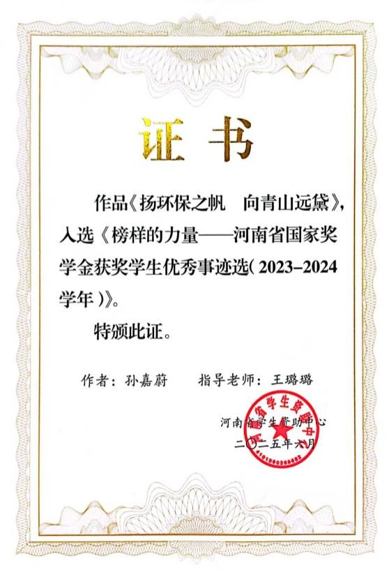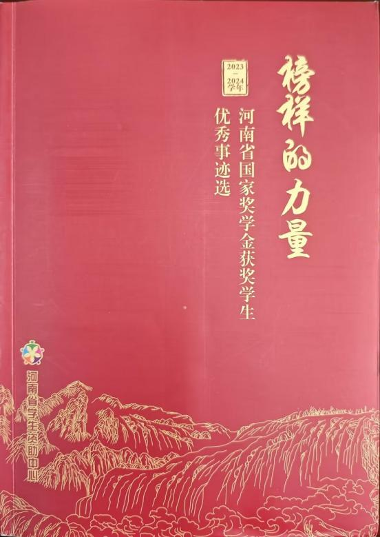 近日,由河南省学生资助中心组织编著的《榜样的力量》2023-2024学年河南省国家奖学金获奖学生优秀事迹选刊印,我校2024年国家奖学金获得者、yl23411永利集团环境工程专业学生孙嘉蔚的优秀事迹被成功选录。