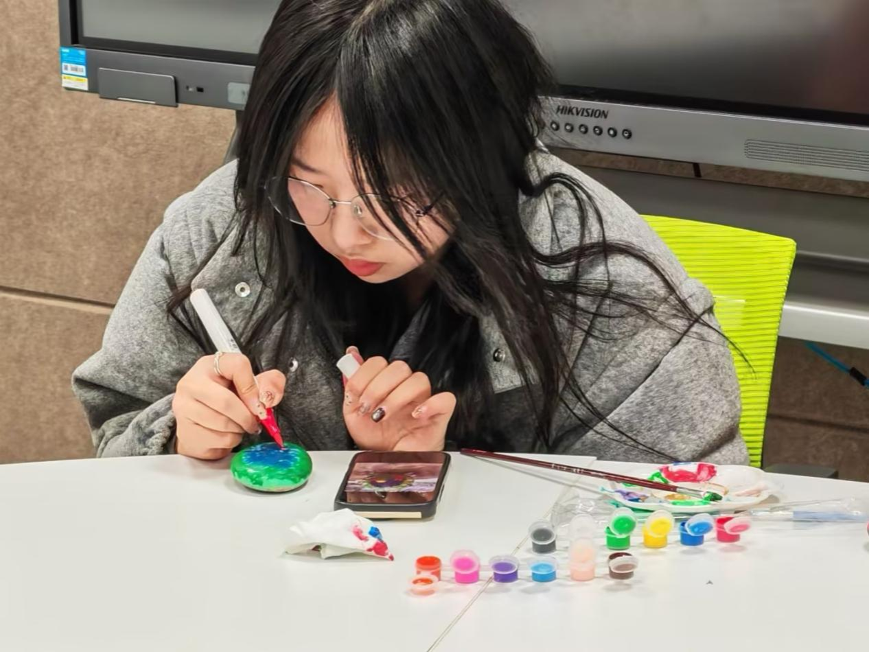 我院王璐璐老师以“非遗艺术与情绪表达”为核心开展专业指导,从石头画起源与发展脉络切入,讲解非遗艺术的传承与创新,重点引导同学们通过艺术创作外化内心情绪,掌握以绘画疏压的方法。大家紧扣“情绪表达”核心,将内心积压的情绪、对生活的感悟转化为笔下的色彩与图案,在方寸石块上勾勒心声、释放压力。整个活动现场,创意的火花与治愈的力量交织,让每一块石头都成为情绪的“避风港”。