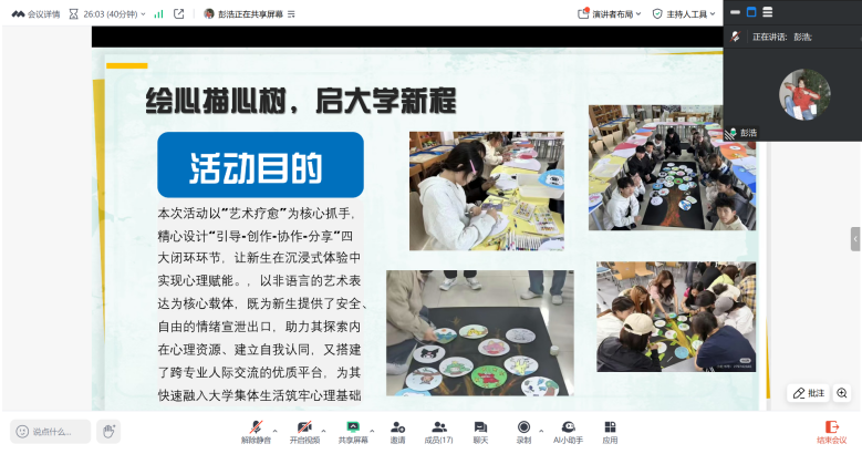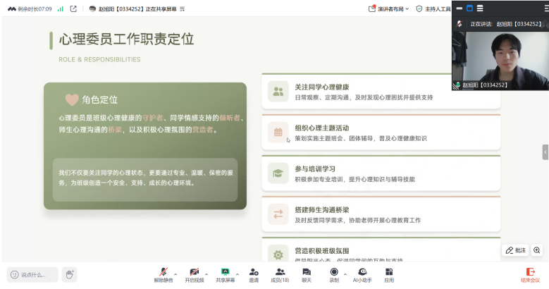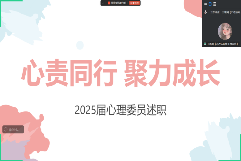 为进一步夯实学院心理健康教育工作根基,完善“校-院-班-寝”四级心理防护体系,切实发挥心理委员朋辈帮扶核心作用,掌握工作方法,提升工作成效,1月27日,我院以腾讯会议形式召开2025年度心理委员述职会议。院党委副书记田永果、辅导员王璐璐及各班心理委员参加本次会议。